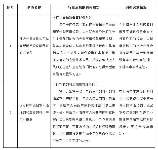 根据《国务院关于上海市进一步推进“证照分离”改革试点工作方案的批复》(国函〔2018〕12号),国务院决定,即日起至2018年12月31日,在上海市浦东新区暂时调整实施下列行政法规规定: