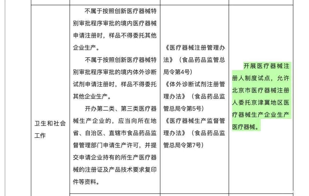 其中批复的“开放措施”中有一条:“开展医疗器械注册人制度试点,允许北京市医疗器械注册人委托京津冀地区医疗器械生产企业生产医疗器械”。